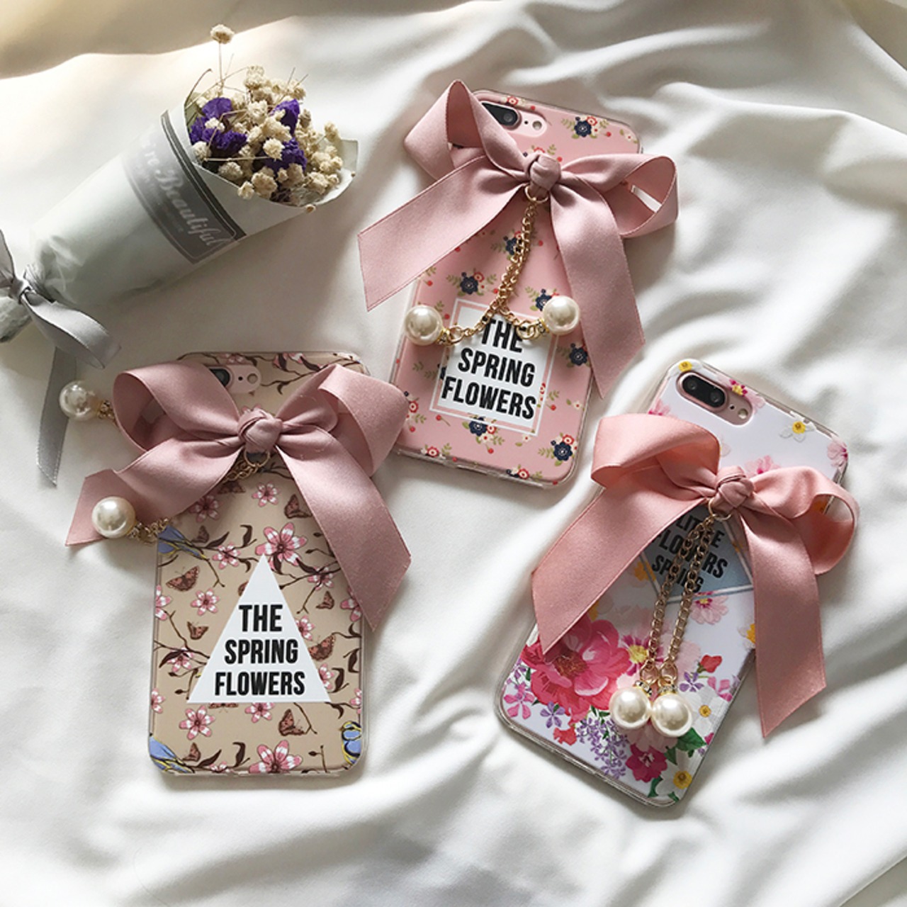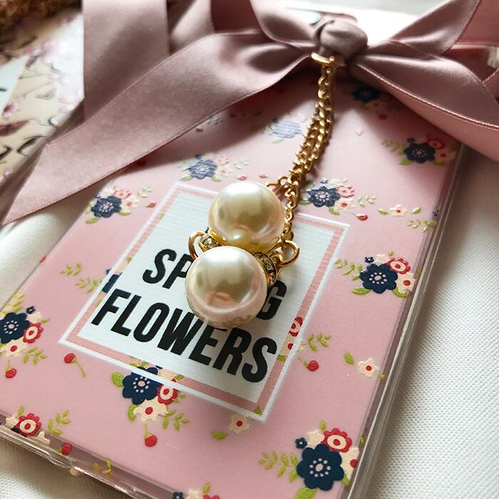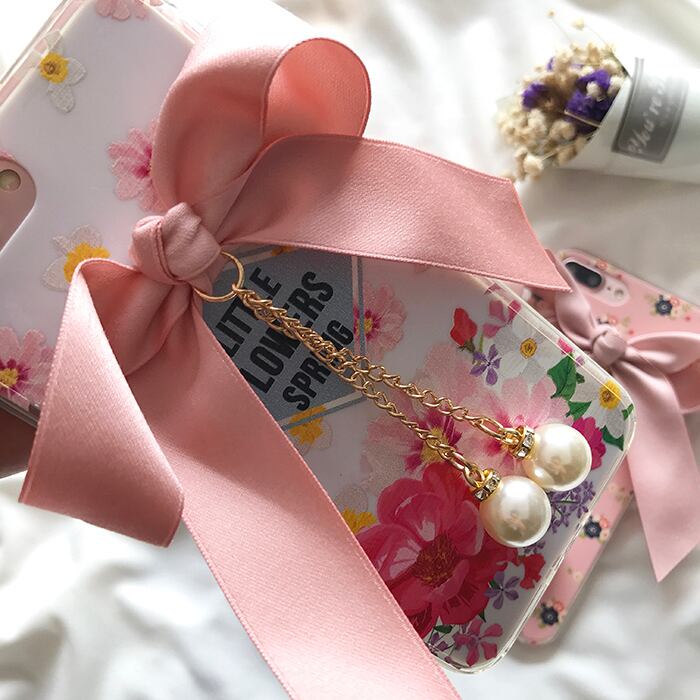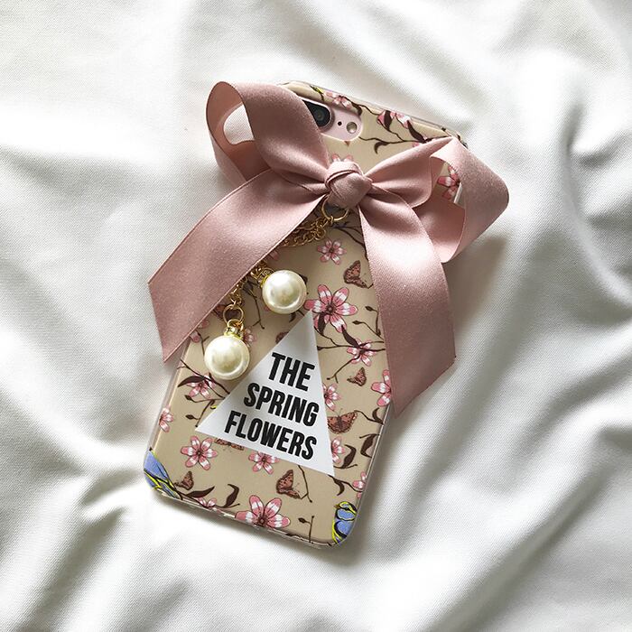 パールやリボンの付いた可愛い花柄のiPhoneケースです☆