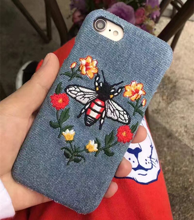 デニム系の布の生地にハチやトラ、ヘビ、花の刺繍が施されてる可愛いiPhoneケースです♡